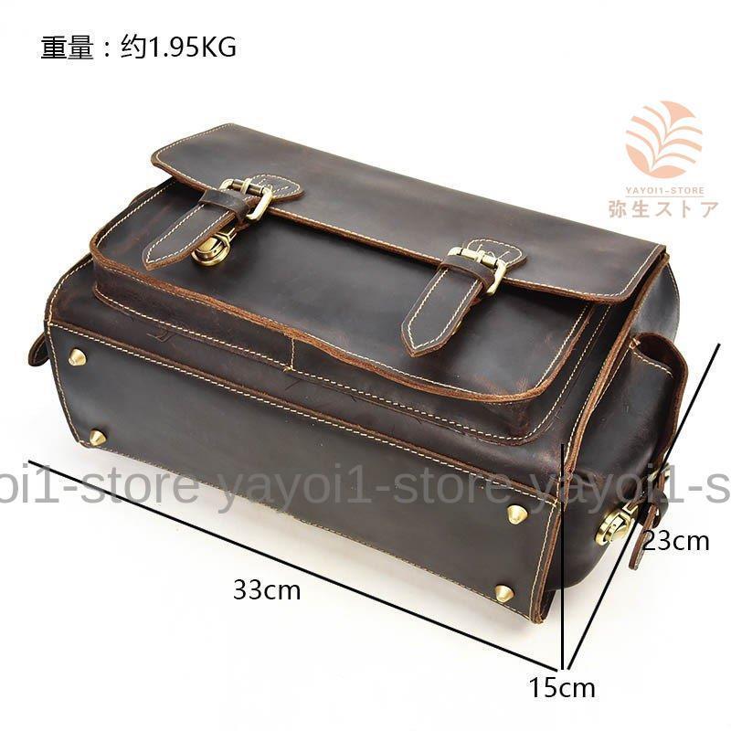 商品情報 原料として、耐久性に優れた成牛一層目の天然革しか採用しません。長期にわたって使用できる逸品です。 適用:通勤、通学、出張 カラー:ブラウン 重量:約1.95kg 外部サイズ:約横33cm×マチ15cm×縦23cm 内部サイズ:約横30cm×マチ12cm×縦20cm 素材:牛革、本革、レザー 内装:耐久性の布地 ショルダーストラップ:布地と本革のコンビ 構成: 1.正面のフラップ下にジッパーポケット*1(雑誌、iPadなど収納可) 2.メイン収納室:カメラ保護ポケット*1(三室、室のマチ調整可) 3.背面:ジッパーポケット*1(携帯、財布収納) 収納:カメラ、iPad、等対応可 ※サイズはすべて外寸です。マチ幅は、内容量により変化します。 ※撮影時の光のあたり方や、モニターの発色の具合などによって実際のものと色が若干異なる場合ございます。何卒、予めご理解の上にお選び下さい。 |